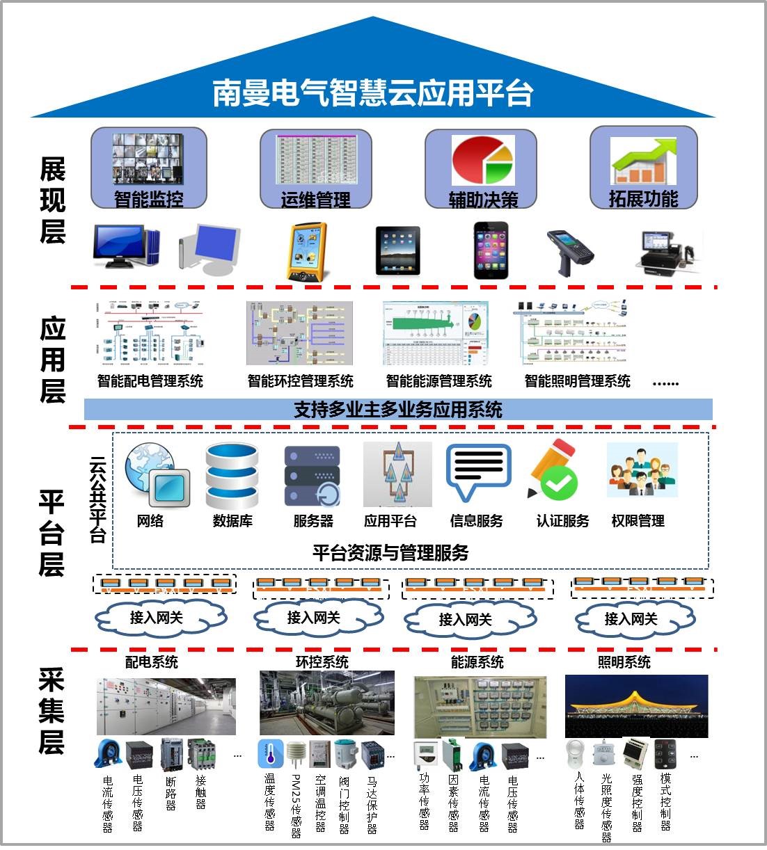 南曼电气智慧云平台可接入多种类的智能监控系统,目前已接入此平台的系统包括地铁、机场、港口、厂矿等各类业主的低压配电系统、环控通风系统、能源管理系统、智能照明系统等,平台既能对采集的数据建立标准进行统一管理,又能对各类业务进行相应的软件组态,满足各类业务具有各自管理特色的需要。